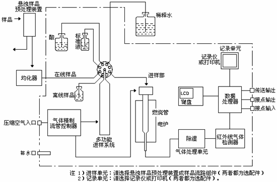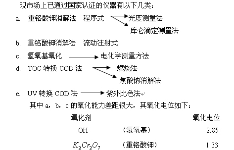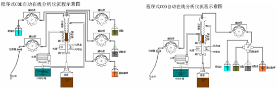 由于CODcr是一個(gè)條件試驗(yàn)方法,不同的物質(zhì)有不同的氧化率,故在線儀器的測量結(jié)果是以國標(biāo)的手工測量法為標(biāo)準(zhǔn)。儀器以不同的條件進(jìn)行實(shí)驗(yàn),其氧化率不同時(shí),就應(yīng)通過和手工分析的數(shù)據(jù)進(jìn)行比較,擬合校正曲線,使測量結(jié)果和手工法一致,但是這種擬合有一定的局限性。 ******鉀消解法 ******鉀法的在線分析儀器中,其氧化率和反應(yīng)速度應(yīng)氧化條件不同而分3類: 完全按照標(biāo)準(zhǔn)手工法的反應(yīng)條件進(jìn)行(程序式標(biāo)準(zhǔn)型) 程序式在線分析析儀器的概念是,仿照手工法,將取樣、加試劑、加液計(jì)量、反應(yīng)器、檢測器、計(jì)算、清洗等集成在一起,通過電機(jī)、氣動(dòng)、閥門、管道,由各種控制器、電腦按設(shè)定的測量周期和程序,自動(dòng)完成取樣、定量、加試劑、反應(yīng)、檢測、清洗、計(jì)算、定標(biāo)等操作,實(shí)現(xiàn)在線自動(dòng)分析。 COD程序式標(biāo)準(zhǔn)型儀器測量速度和標(biāo)準(zhǔn)手工法相近,需1-2小時(shí),儀器構(gòu)造基本是將手工法實(shí)驗(yàn)室的裝置搬入儀器內(nèi),再加上氣壓輸液系統(tǒng)、機(jī)電器件和控制系統(tǒng),實(shí)現(xiàn)自動(dòng)測量。有的儀器甚至連手工法的電爐和回流裝置,都是一點(diǎn)不改地原樣照搬進(jìn)去。這種儀器的氧化率與標(biāo)準(zhǔn)手工法相近,測量范圍通常是30―5000(通過改變?cè)噭舛取⑷颖笮。侄鄼n測量范圍)。因是使用滴定法,水體色度對(duì)測定無影響,準(zhǔn)確度較高。但結(jié)構(gòu)復(fù)雜。