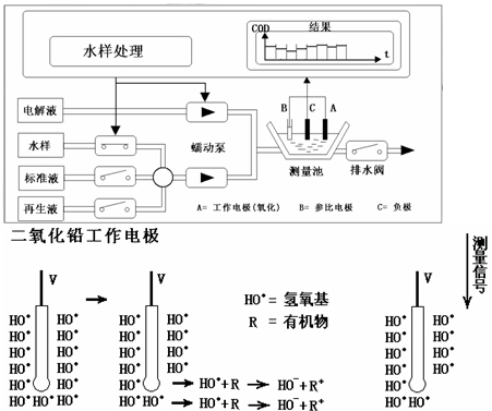 非******鉀法 氫氧基法-(電化學(xué)測量方法) 其測量原理是用電化學(xué)反應(yīng),當(dāng)污水與電解質(zhì)Na2SO4定量進(jìn)入反應(yīng)槽,污水中所含的有機(jī)物會(huì)被電極表面所產(chǎn)生的氧化劑“氫氧基”所氧化,同時(shí)也消耗電流。 當(dāng)工作電極(PbO2電極)保持一定電位時(shí),污水中的有機(jī)物被氧化所消耗的電流與有機(jī)物的濃度呈一定關(guān)系,在校正后可計(jì)算出COD值。
