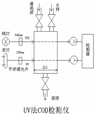 紫外吸收光度計(jì)(UV計(jì)光譜法) 儀器以低壓汞燈作為紫外光源,光源發(fā)出的紫外光通過濾光片分離出254nm的紫外光和546nm的可見光,采用雙波長分光光度計(jì)作為參考波長,并且由光電二極管檢測出光強(qiáng),檢測出的信號(hào)通過放大器送到微處理器,546nm的光強(qiáng)用于補(bǔ)償濁度的影響,經(jīng)過計(jì)算后輸出測量結(jié)果
